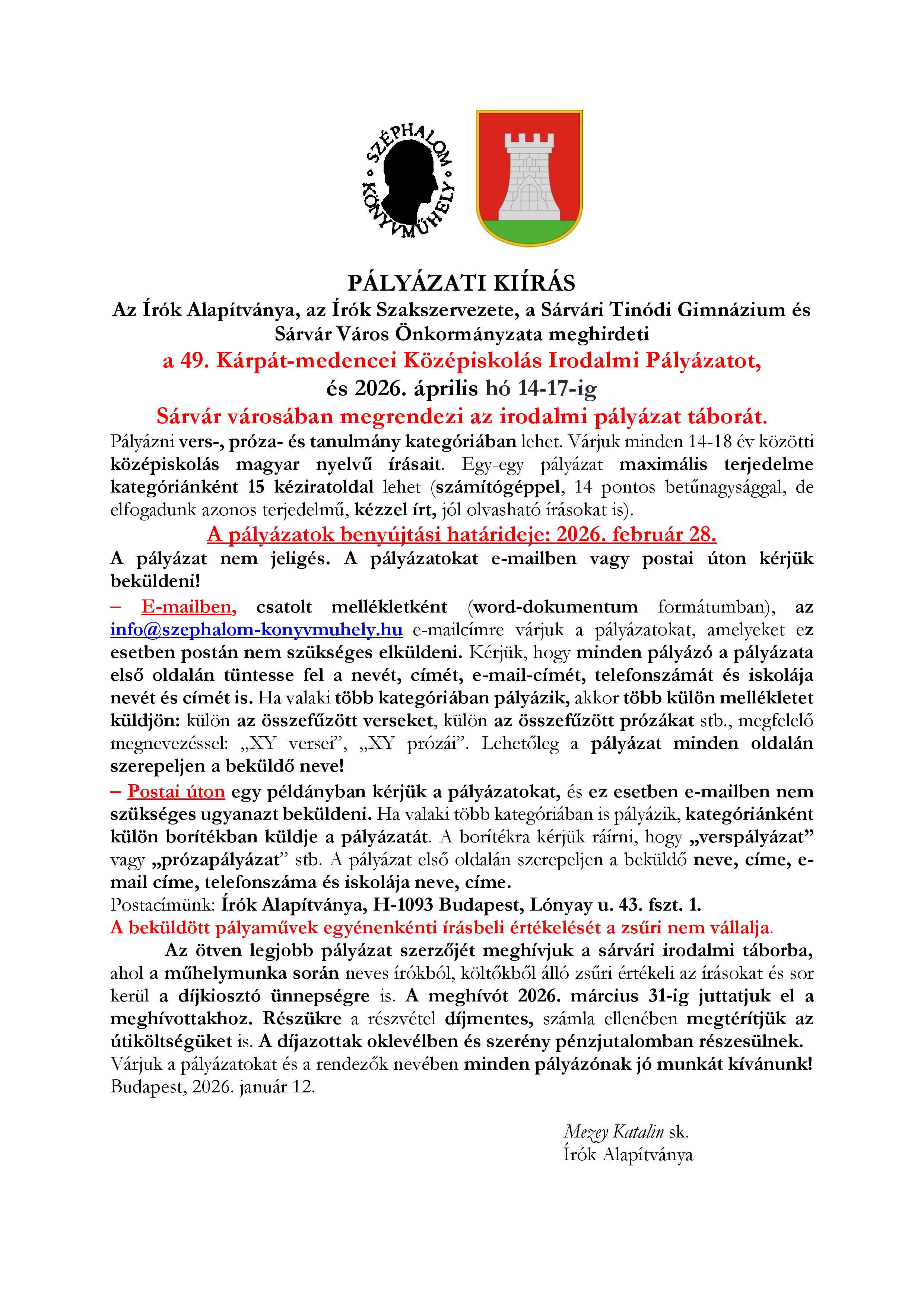 https://www.sarvaritinodi.hu/sites/default/files/2026-01/P%C3%81LY%C3%81ZATI%20… Címkék Diákírók, diákköltők találkozója 2026. január 13.