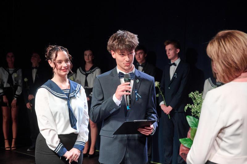 „Ma este itt állunk egy különleges pillanatban. A szalagavató nem csupán egy ünnep a naptárban – ez egy jelképes határvonal, ahol a múlt és a jövő egy pillanatra összeér: a gyermekévek lassan elmúlnak, a felnőtté válás kapujában megállva egy apró, de jelentőségteljes szimbólum kerül a tanulók mellkasára – a szalag. Ez a kis szövetdarab ma este azt jelképezi, kedves végzősök, hogy készen álltok arra, hogy saját életetek kovácsai legyetek.”