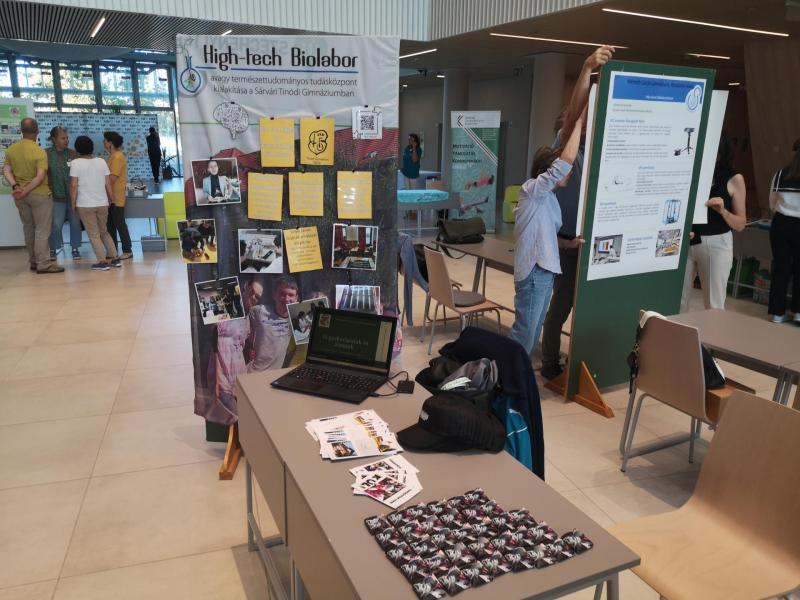 Másnap reggel telekocsival jutottam ki a Neumann János Egyetem GAMF Műszaki és Informatikai Kar aulájába, ahol felállítottam a standot: a szórólapokat, a szabadulószoba ígérvényeket, a molnárkamodellt rejtő ajándékcsomagokat, a 11. évfolyamos természettudományos fakultációsok által kialakított posztert és a bemutatkozó kisfilmet, prezentációt futtató laptopot. A szomszédos stand a Miskolci Egyetem Földes Ferenc Gyakorló Gimnáziumé volt. Sikerült végignéznem a felhozatalt: az egzotikus állatbenutatótól az űrkapszulán át a pcr alapú nyomozójátékig. Személyes kedvencem Titán, az óriáscsiga volt, akit meg is simogathattam. Ezt a nagyelőadóban a Selye projektek bemutatása követte. Mikulás Domonkos igazgató úr, a Magyarországi Diáklaborok Egyesülete elnöke elmondta, hogy a pályázat 2 éve alatt 6000 laborfoglakozáson 24 ezer kontaktórán 71 ezer diák vett részt. Imponáló számok…
